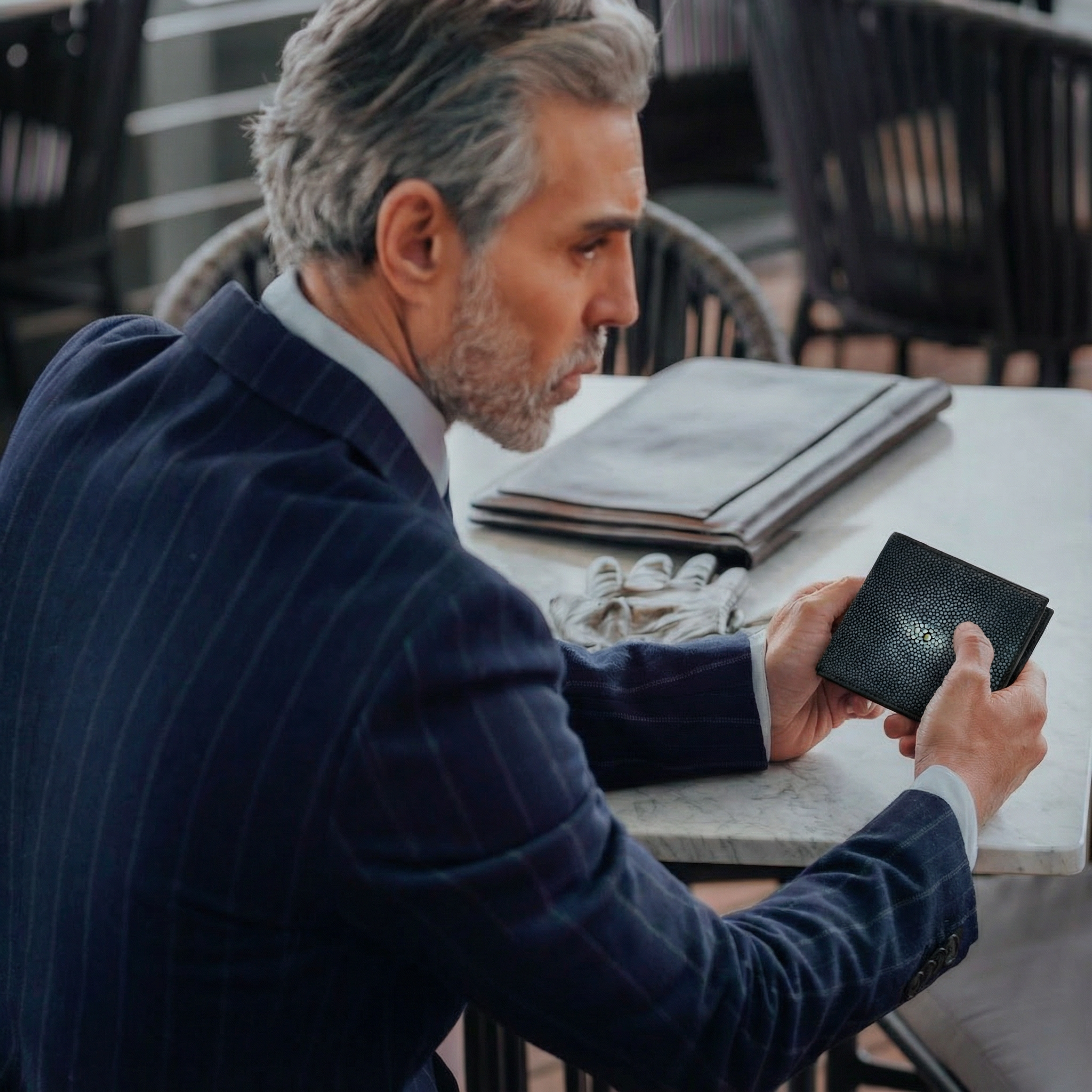 The exterior of the wallet is made from natural stingray leather. This is a material exceptionally rare in classic leather goods, not only due to its price, but above all because of the extreme difficulty of working with it. Its surface is composed of fine, mineral-like beads that, both in appearance and touch, can be compared to polished pearls, porcelain, or very fine, smooth stone. Stingray leather is among the most durable natural leathers, highly resistant to abrasion, moisture, and intensive everyday use.
