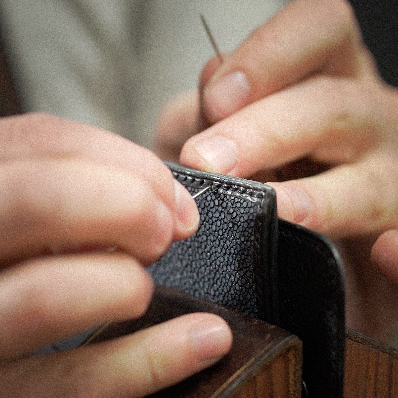 The stingray wallet is entirely hand-stitched using the saddle stitch technique.This is the most durable stitching method in leather craftsmanship. Each stitch is made with two needles and a single thread, ensuring that even if one stitch is damaged, the seam will not unravel. This technique provides exceptional strength,perfect symmetry, and complete control over every detail. Saddle stitch has been used for centuries is used for sewing horse harnesses and saddles, where reliability is key. In addition, it stands out for its noble, timeless aesthetics, that highlights the artisanal nature of the product.